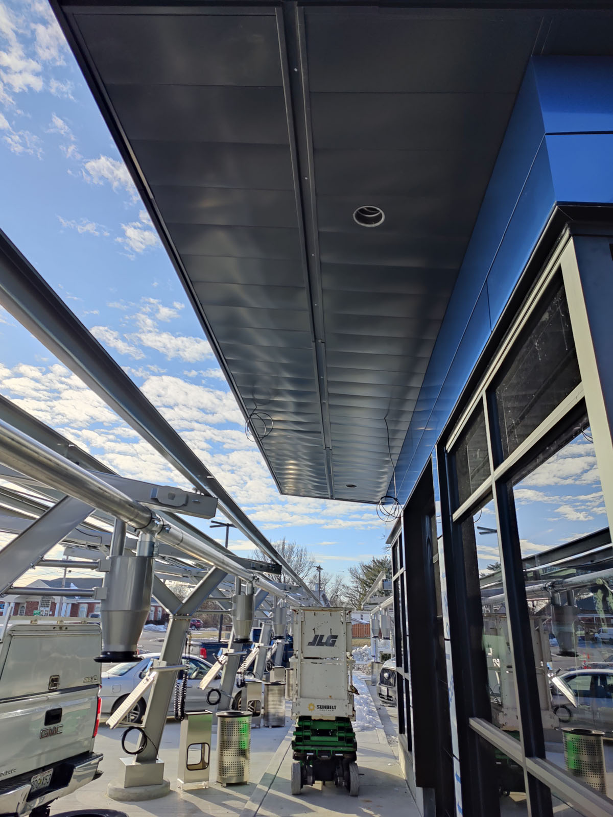 For the interior metal work, our team fabricated clean ACM sections to cover unsightly conduits, communication lines, plumbing lines, and other building components, providing a much more aesthetically pleasing finish compared to the original appearance.